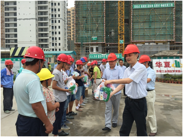 2016年7月27日上午,為切實(shí)做好建筑工地防暑降溫工作,讓施工人員在溫馨的工作環(huán)境中安全作業(yè),園區(qū)黨工委委員、管委會(huì)副主任、規(guī)劃建設(shè)局局長(zhǎng)許紹杰、副局長(zhǎng)張循在開(kāi)發(fā)公司副總裁劉建華的陪同下冒著酷暑慰問(wèn)夢(mèng)家園工地一線施工人員。
