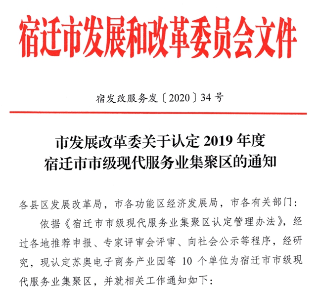近日,根據(jù)《市發(fā)展改革委關(guān)于認(rèn)定2019年度宿遷市市級(jí)現(xiàn)代服務(wù)業(yè)聚集區(qū)的通知》,蘇宿園區(qū)生產(chǎn)力中心成功創(chuàng)成宿遷市市級(jí)現(xiàn)代服務(wù)業(yè)聚集區(qū)。