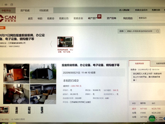 8月21日上午10時,城發(fā)公司報廢廚具、辦公設備、電子設備、鋼構(gòu)棚子等物資網(wǎng)上拍賣開始,7家競買人,經(jīng)過1小時44分10秒244次的緊張激烈競價,最終以228700元成交標的,比評估價90200元高出138500元,溢價率153.55%。