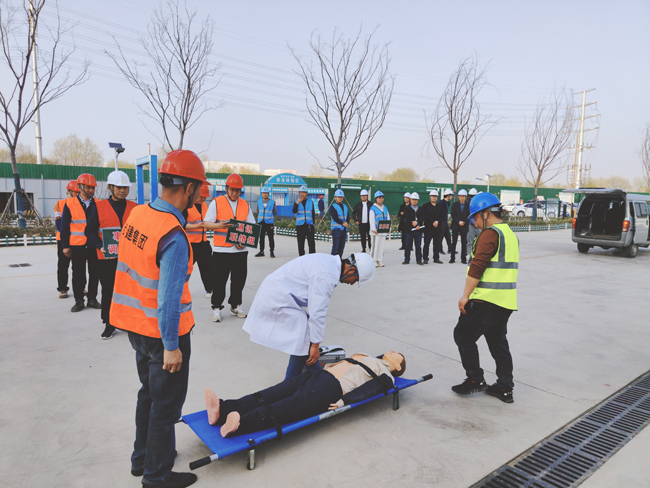 本次演練共分6個(gè)小組,分別為:現(xiàn)場模擬組、現(xiàn)場警戒(搶修)組、應(yīng)急救援(疏散)組、通訊聯(lián)絡(luò)組、事故調(diào)查組、 觀摩組。假設(shè)工人在生活區(qū)違規(guī)使用大功率電器突發(fā)火災(zāi),被煙霧和火勢圍困,二樓有人發(fā)出救援信號,正在附近巡查的安全員發(fā)現(xiàn)情況后,立即趕赴現(xiàn)場并打電話給項(xiàng)目生產(chǎn)負(fù)責(zé)人,在接到通知后,項(xiàng)目生產(chǎn)負(fù)責(zé)人迅速安排項(xiàng)目部應(yīng)急救援辦公室負(fù)責(zé)人,并啟動(dòng)應(yīng)急預(yù)案,各救援小組立即到達(dá)現(xiàn)場開展工作,安全員迅速引導(dǎo)全體人員有序從疏散樓梯疏散到安全位置,救援組帶著擔(dān)架、急救箱等趕赴現(xiàn)場,將“受傷”人員用擔(dān)架從房內(nèi)撤離到安全位置,同時(shí)救援醫(yī)生對“受傷”人員進(jìn)行簡單的心肺復(fù)蘇、人工呼吸,并迅速送往醫(yī)院進(jìn)行治療。