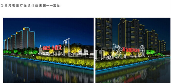 在園區(qū)東入口為民河的一畔,一座座生動的城市剪影燈光造型在青海湖西路兩側一字排開。有象征著新加坡元素的“魚尾獅”,有蘇州工業(yè)園區(qū)金雞湖畔的東方之門、摩天輪和李公堤,還有西楚霸王項羽騎馬的颯爽英姿。造型以蘇州、宿遷和新加坡城市建筑輪廓線、城市主題雕塑為基本元素,以剪影形式為載體,以現(xiàn)代高科技LED燈光為表現(xiàn)手段,通過炫麗動感的光影效果,在夜色中描繪出了一副靚麗多姿的畫卷,生動地展現(xiàn)出了園區(qū)“從新加坡到蘇州再到宿遷”和“在宿遷、為宿遷”的發(fā)展理念。